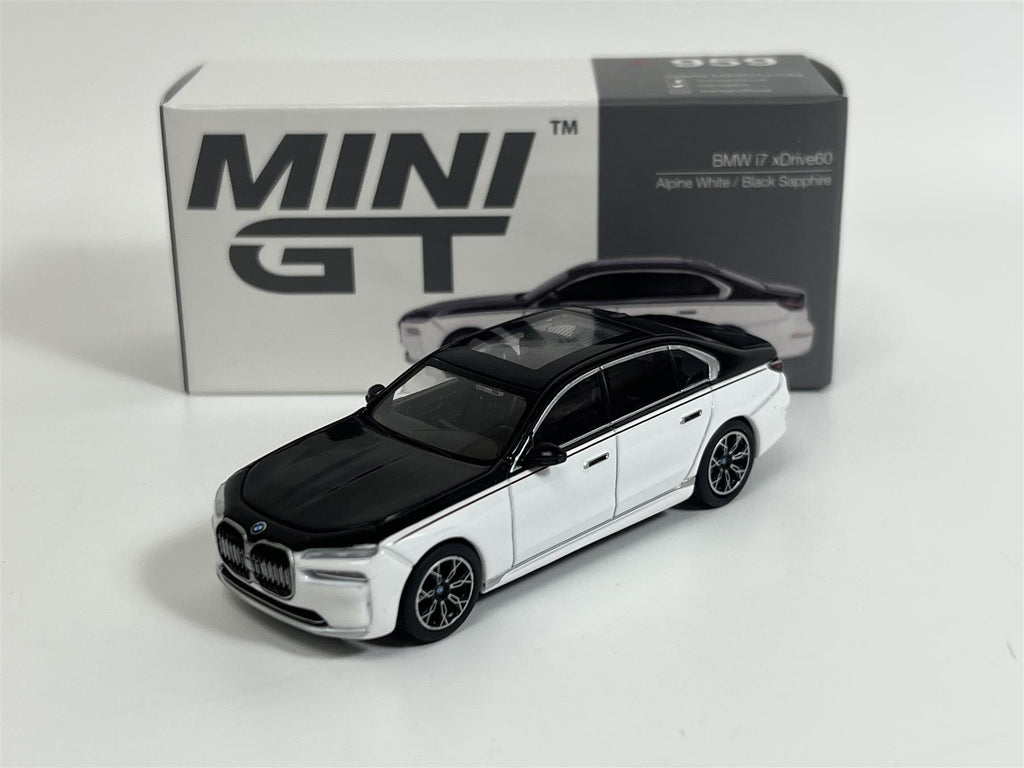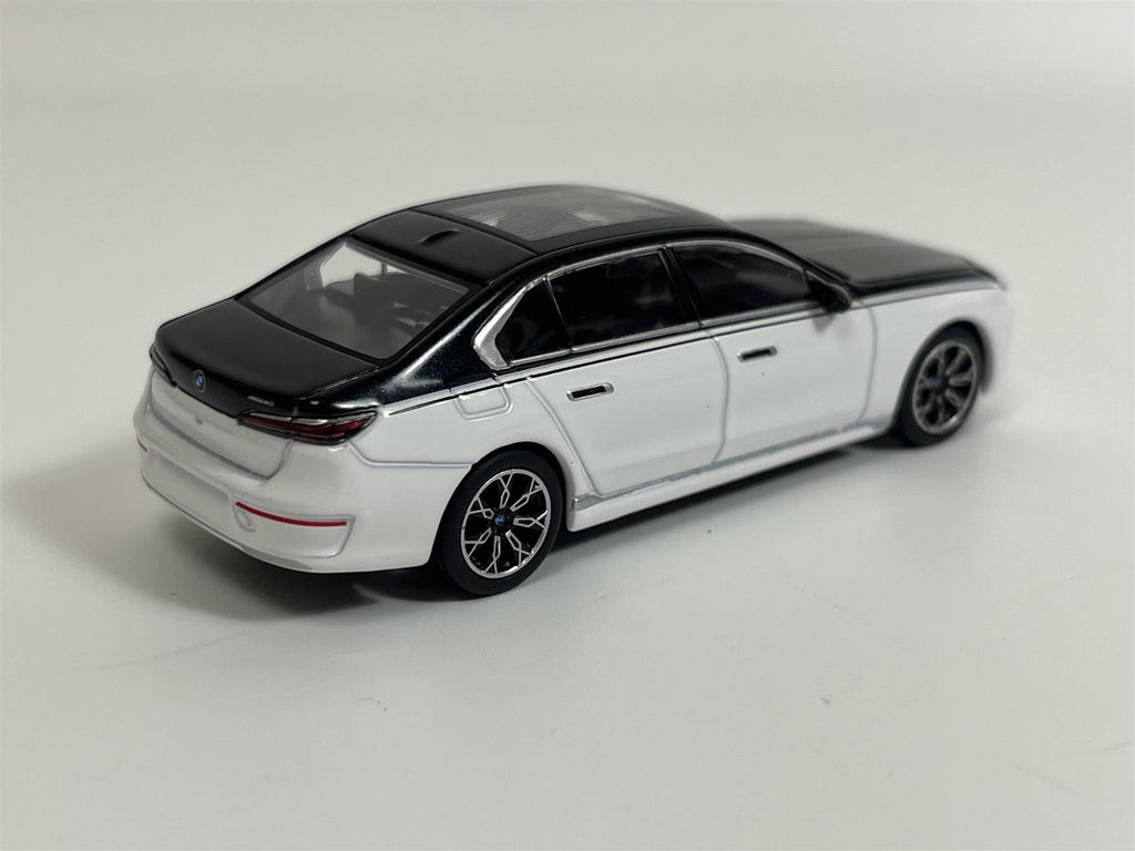 BMW i7 xDrive60 Alpine White Black Sapphire RHD 1:64 Mini GT MGT00959R