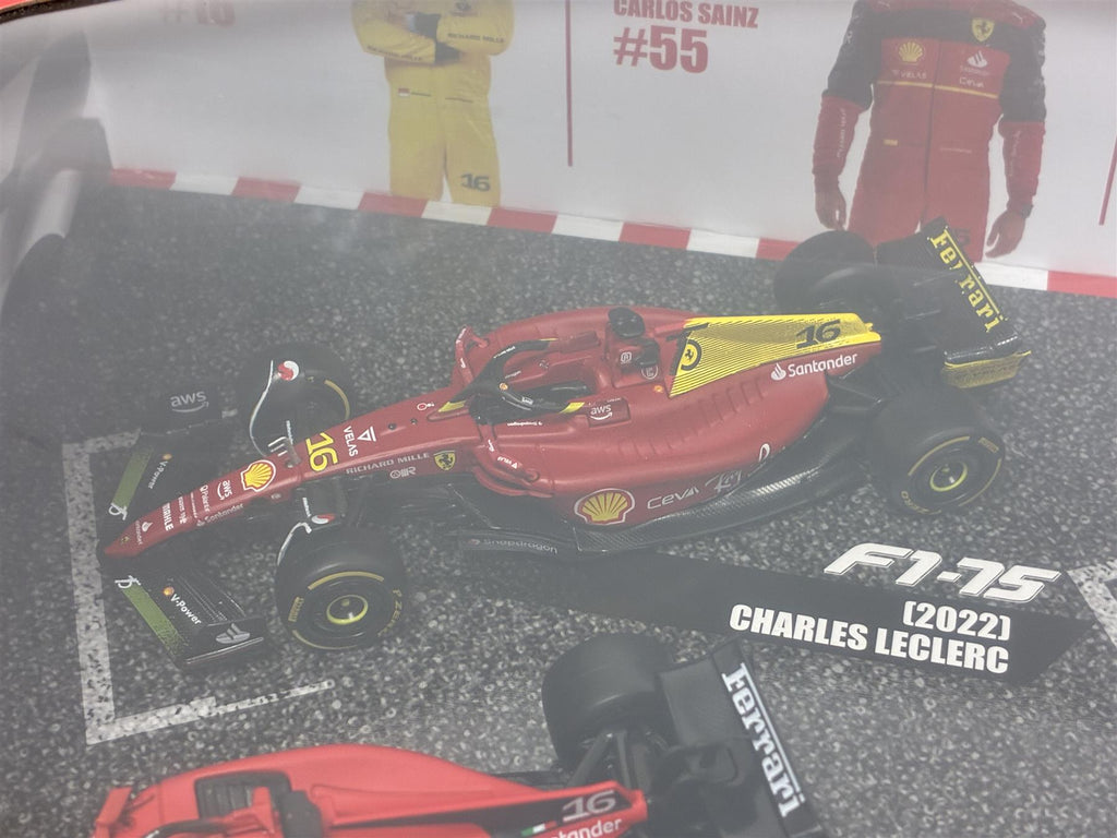 1:43 Scale 4 Car Set Includes F1-75 2022 #16 Charles Leclerc, F1-75 2022 #55 Carlos Sainz, SF-23 2023 #16 Charles Leclerc, and SF-23 2023 #55 Carlos Sainz Diecast metal with plastic parts Boxed New