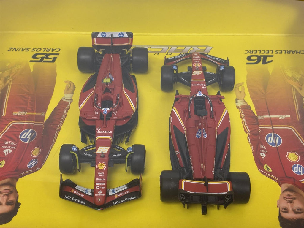 1:43 Scale 2 Car Set Ferrari SF-24 #16 Charles Leclerc and #55 Carlos Sainz Diecast metal with plastic parts Can be hung on wall Boxed New