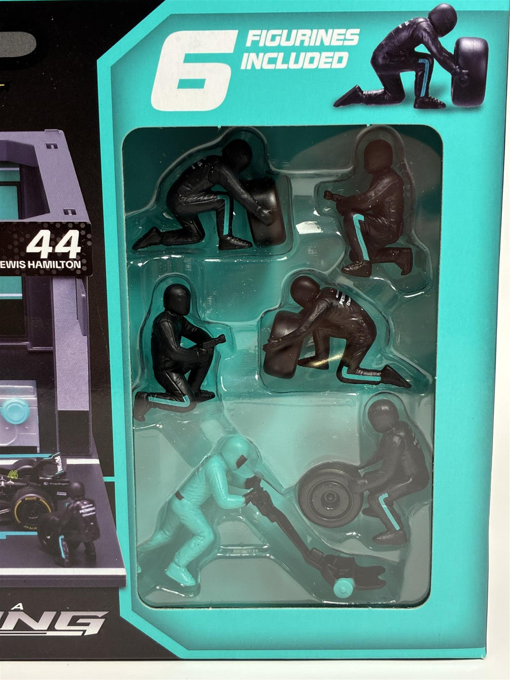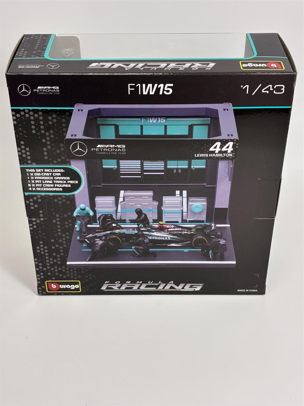 1:43 Scale Mercedes-AMG Petronas Pit Pass Diorama with Lewis Hamilton F1W15 Seasonal Livery Set Includes 1x Diecast Car, 1x Paddock Garage, 1x Pit Lane Track Piece, 6x Pit Crew Figures and 4x Accessories Boxed New
