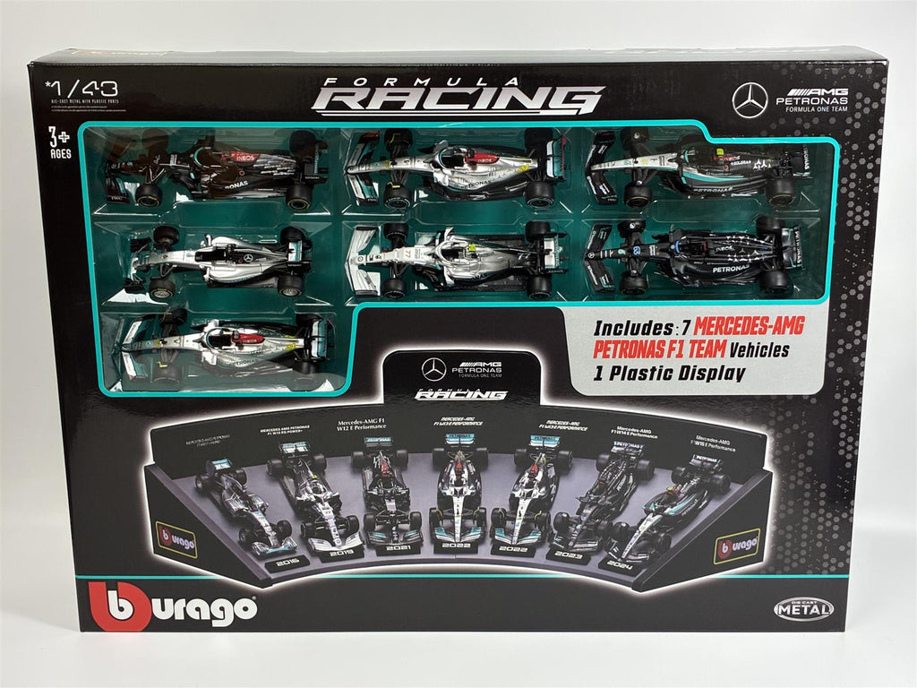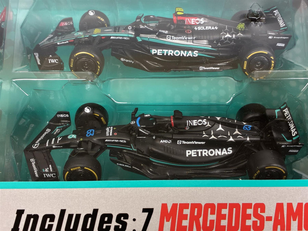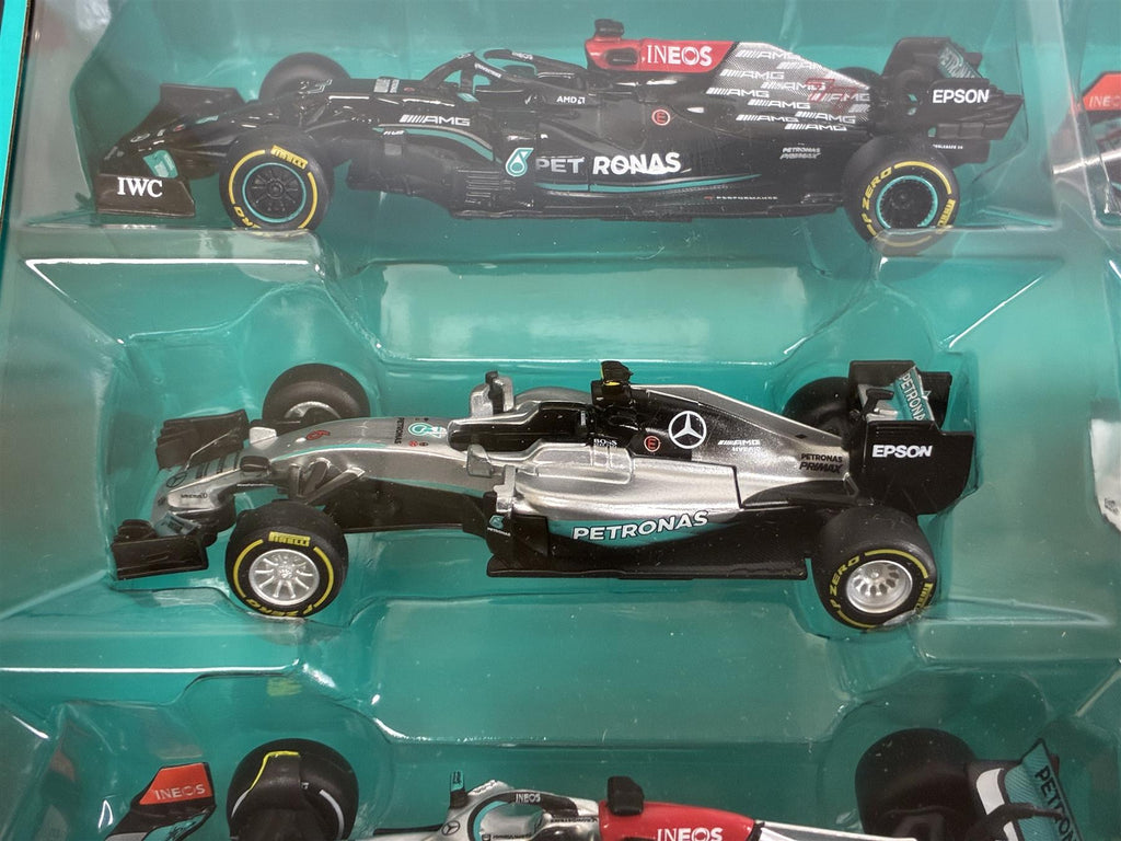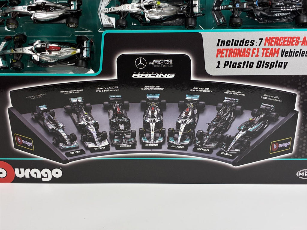 Mercedes AMG Petronas Formula 1 Set of 7 Cars with Display Stand 1:43 Scale Bburago 38170