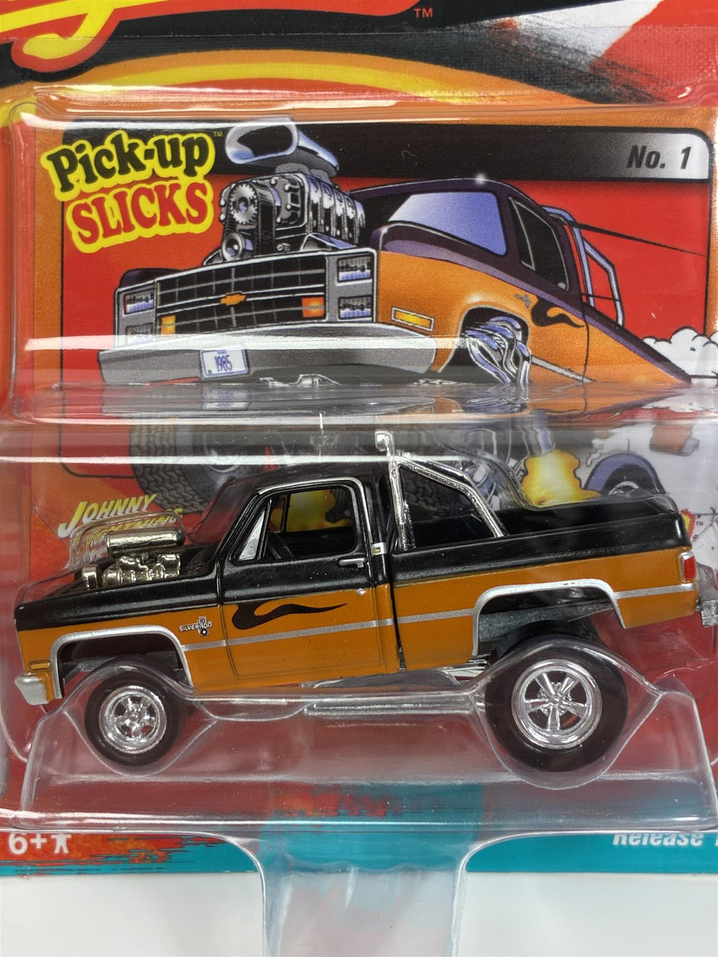 1985 Chevy Silverado C10 Fleetside Sunset Orange Metalic Gloss Black 1:64 Johnny Lightning JLSF023